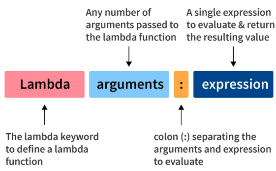 The following figure outlines the building elements of a lambda function, as any other python function it takes some arguments, applies an expression and produces a result.