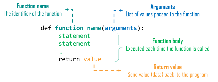 Formally speaking a function definition in Python specifies: (1) the name of the function, (2) the arguments it takes, (3) the sequence of statements that run when the function is called and (4) the value (or object) returned to the main program, refer to the following figure.
